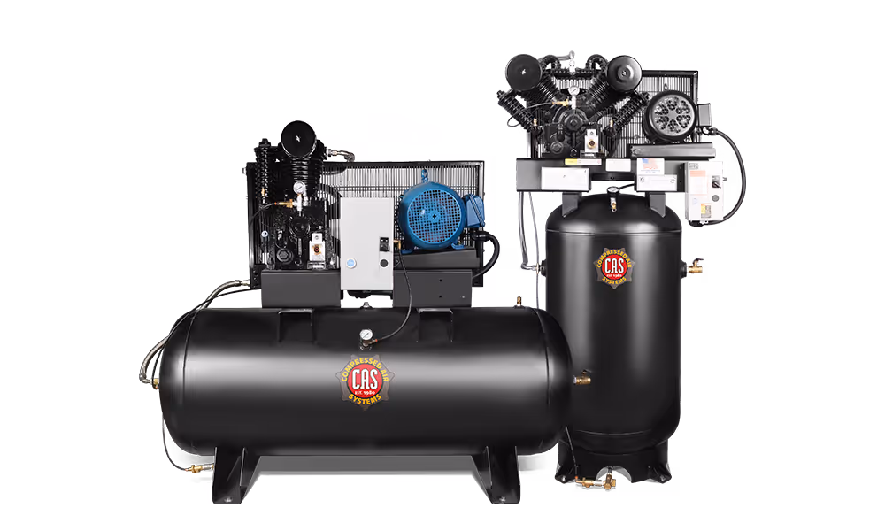 Electric compressors with heavy-duty two-stage solid cast iron pumps. Designed to be used every day in automotive maintenance facilities, production facilities, fabrication facilities, and many more.