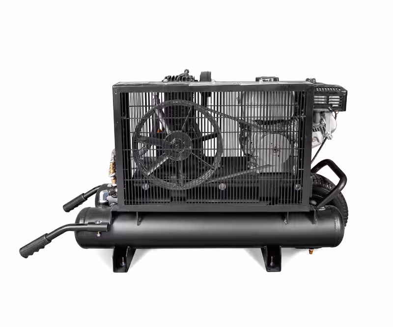 Portable air compressor driven by an industrial-grade 5.5 HP Honda gas engine. Featuring the LH2 single-stage pump with reed valves. Available with 10 or 20 gallon wheelbarrow-style tanks with solid rubber tires and bolt-on handles. Ideal for farms and ranches, mobile applications, and construction sites without electrical power access.